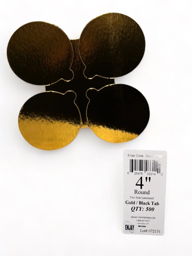 Introducing the elegant 4-inch Gold Mono Board – a luxurious choice for showcasing individual pastries and confections. Crafted from high-quality cardboard, one side boasts a laminated, shimmering high-gloss gold finish, while the reverse presents a sleek laminated solid black finish. The dual-sided design allows users the flexibility to choose the desired display side based on their presentation preferences.